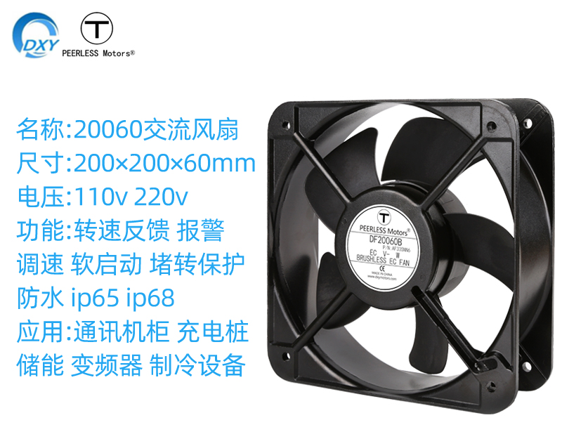 特性:20060采用交流转直流EC电机功率小、因数高、比纯交流散热风机转速上限高,能耗小,主用于储能设备,电池化成设备。支持110v交流电压,电压工作范围85v-130v,支持220v交流电压,电压工作范围150v-240v