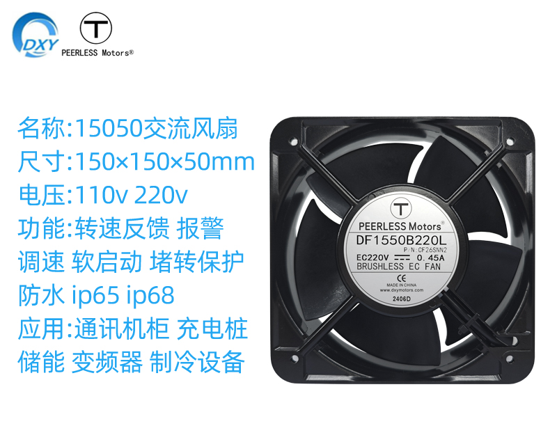 特性:15050EC交流风扇采用铝质外框搭配PBT扇叶和滚轴轴承,结构稳定,能承受大风量及大风压,振动小,承压时间长